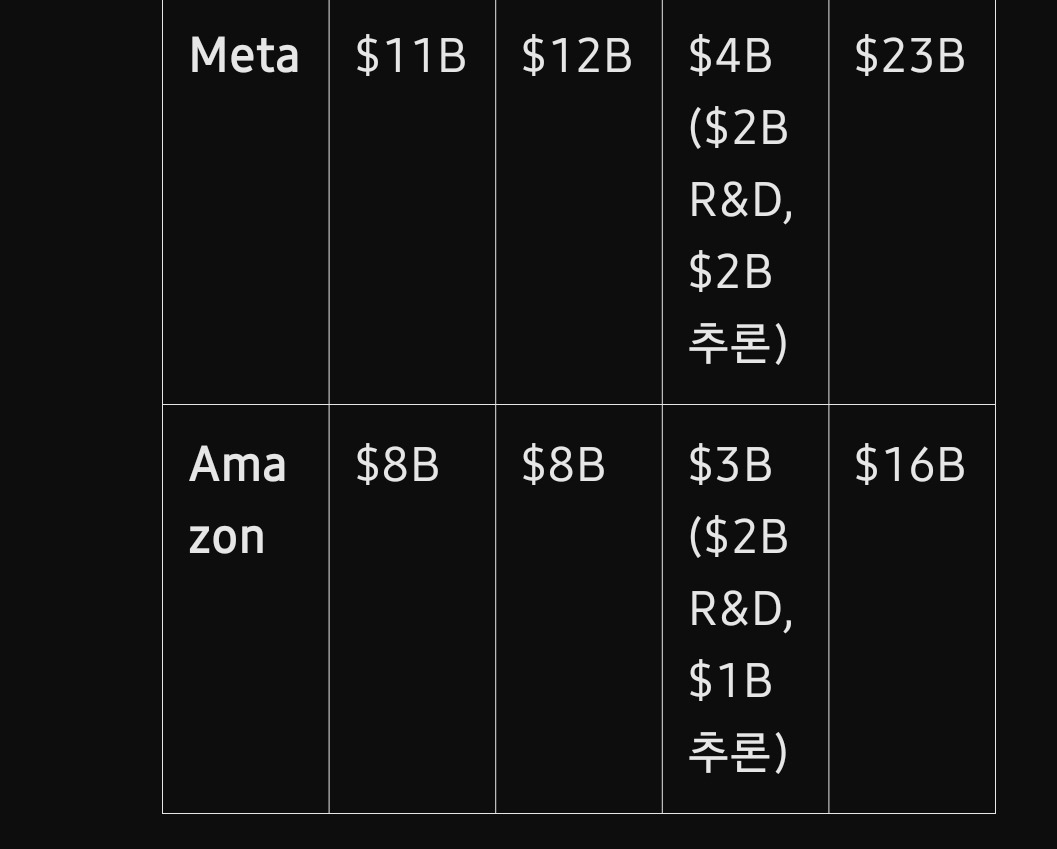 Google: 총 290억 달러를 투자하며, AI 모델 훈련과 운영 효율성을 동시에 중점적으로 관리.