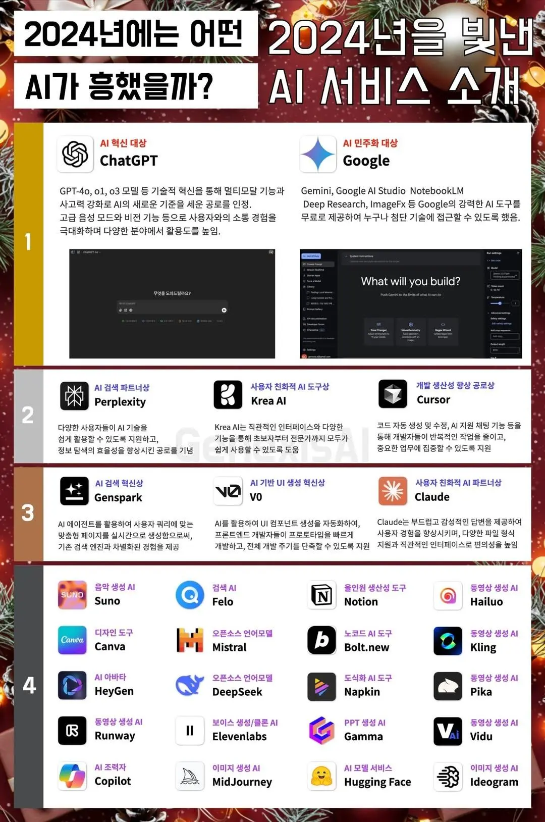 2024년은 인공지능(AI)이 일상과 산업 전반에서 중요한 변화를 이끈 해였습니다. 대형 플랫폼들의 혁신적인 경쟁과 특화된 AI 서비스의 부상, 그리고 미디어 제작, 기업용 솔루션의 진화까지 AI는 다양한 영역에서 새로운 가능성을 제시했습니다. 아래에서 이러한 트렌드와 주요 서비스를 통합적으로 분석하겠습니다.