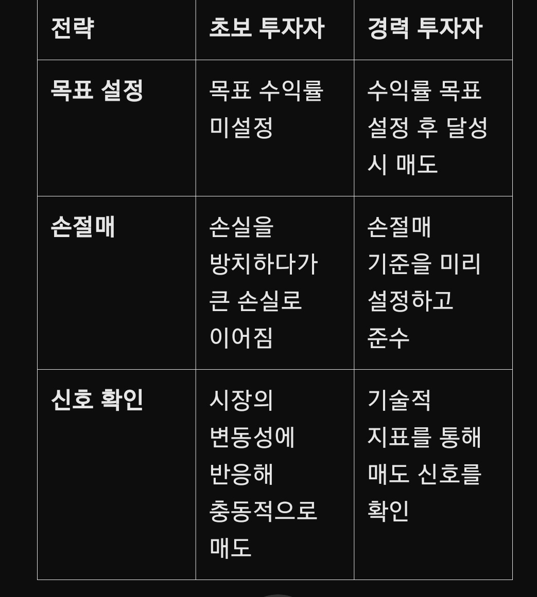 매도는 이익 실현뿐만 아니라 손실을 방지하기 위한 중요한 과정입니다. 아래는 초보와 경력자의 매도 전략 차이입니다.