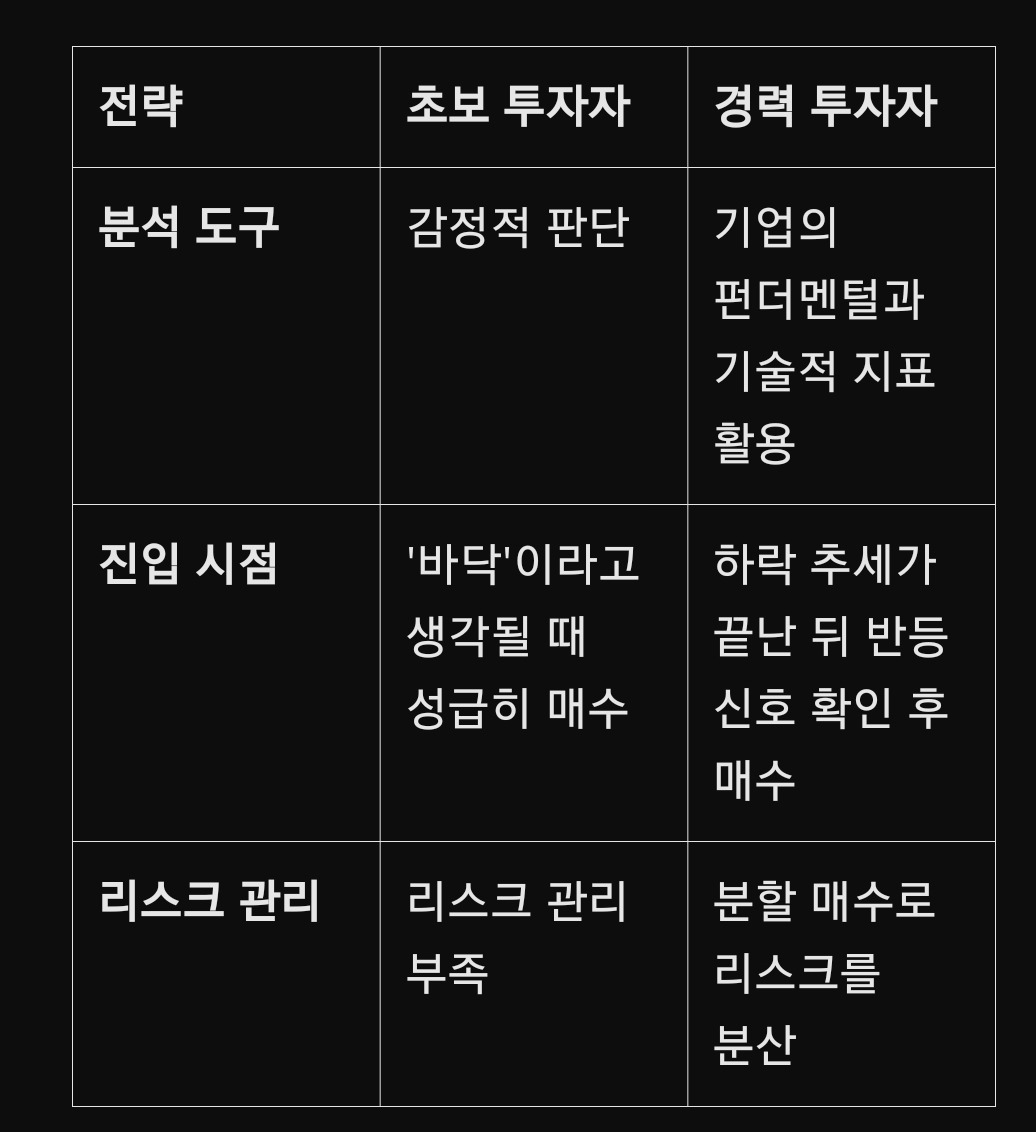 하락장에서 '더 이상 떨어지지 않을 것'이라는 막연한 기대감으로 성급히 매수에 나서지만, 이는 큰 손실로 이어질 수 있습니다.