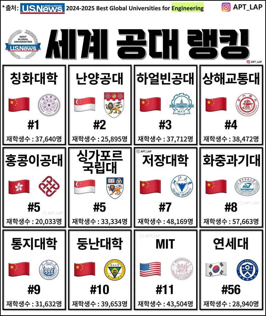 아시아 대학이 TOP 10 중 9개를 차지하며, 공학교육의 중심지가 아시아로 이동하고 있음을 보여줍니다.