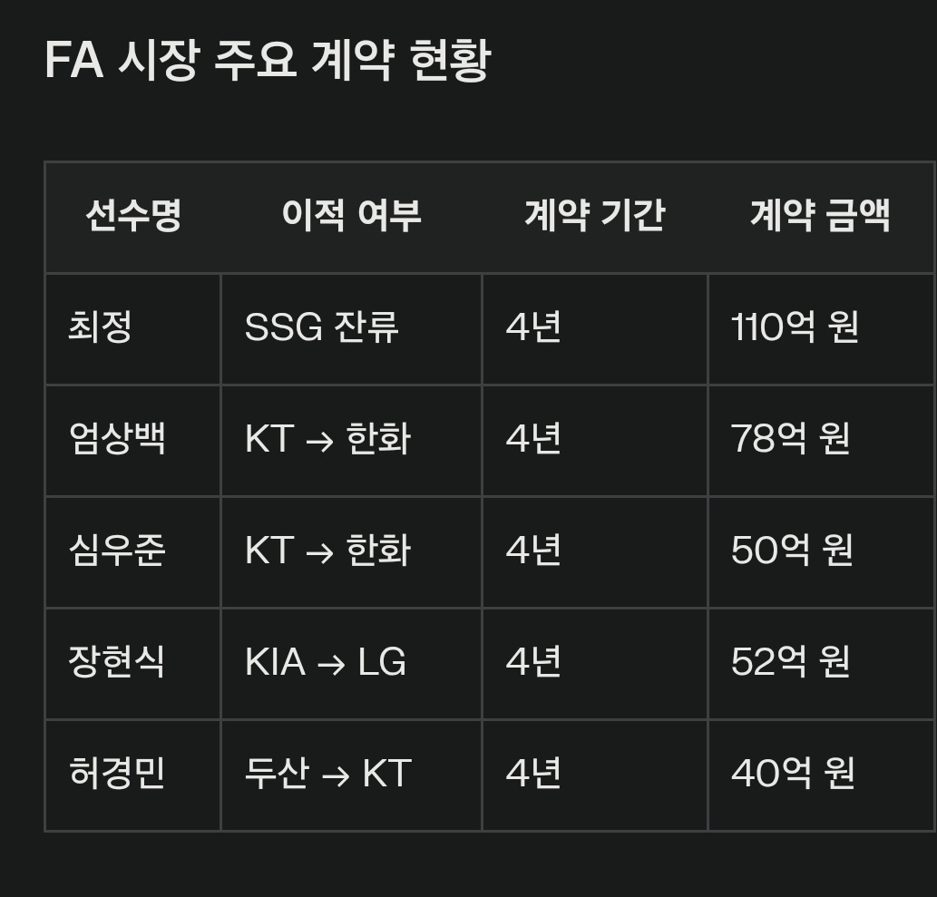 2025년 FA 시장에서는 총 17명의 선수가 새로운 계약을 체결했으며, 다음과 같은 주요 선수들이 주목받았습니다.