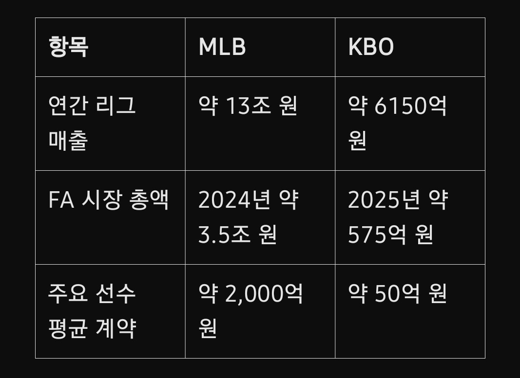 KBO 리그의 FA 시장은 세계적인 야구 리그인 MLB에 비해 상대적으로 작은 규모입니다. MLB와 KBO의 시장 데이터를 비교하면 다음과 같은 차이가 드러납니다.