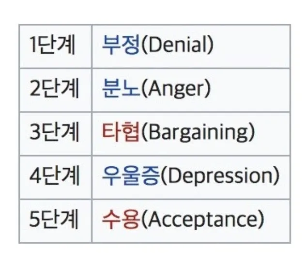 이미지에 나타난 단계들은 쿠블러 로스(Kübler-Ross)의 5단계 슬픔 모델을 보여주고 있습니다. 각 단계는 다음과 같습니다.