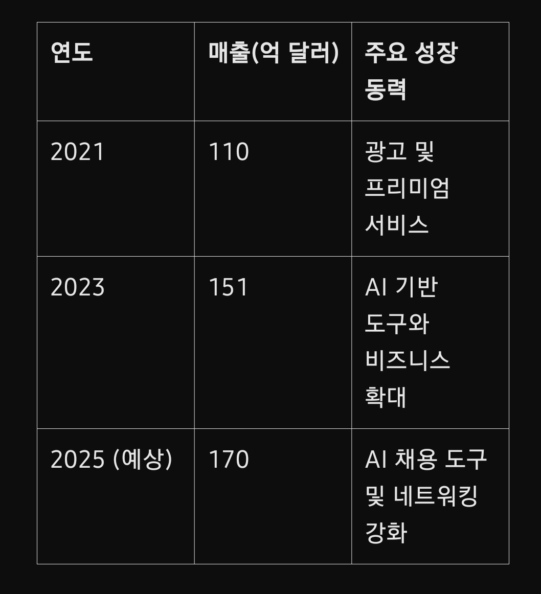 LinkedIn의 매출은 전년 대비 10% 증가하여, 2023년에는 151억 달러를 기록했습니다. 이 중 B2B 광고와 프리미엄 구독 서비스가 주된 성장 동력이었습니다.