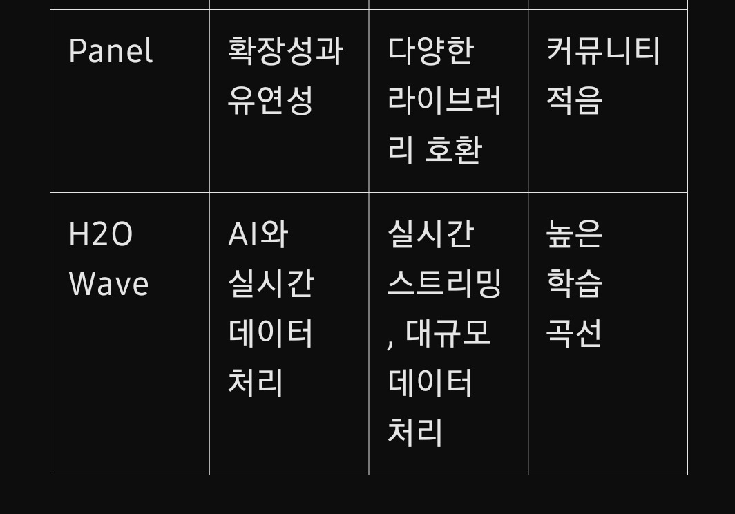 H2O Wave는 AI 및 실시간 데이터 기반 프로젝트에 적합하며, 기업 환경에서 활용도가 높습니다.