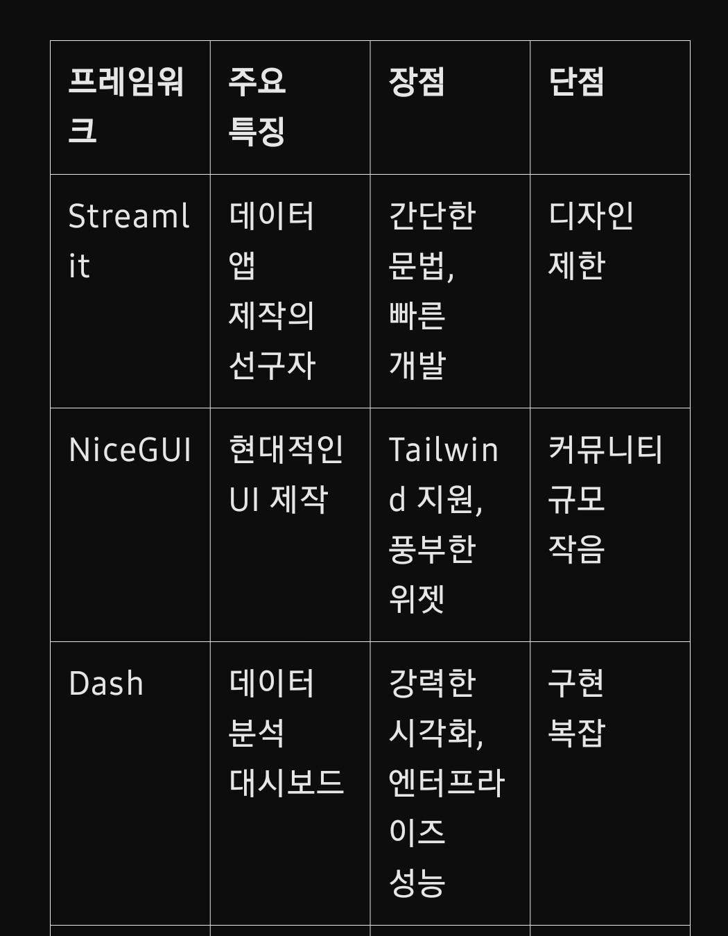 Streamlit은 데이터 분석과 시각화 중심의 간단한 대시보드를 제작하기에 이상적입니다. 특히 데이터 사이언스 워크플로우에 쉽게 통합되며, 파이썬 학습 초기에도 활용할 수 있습니다.