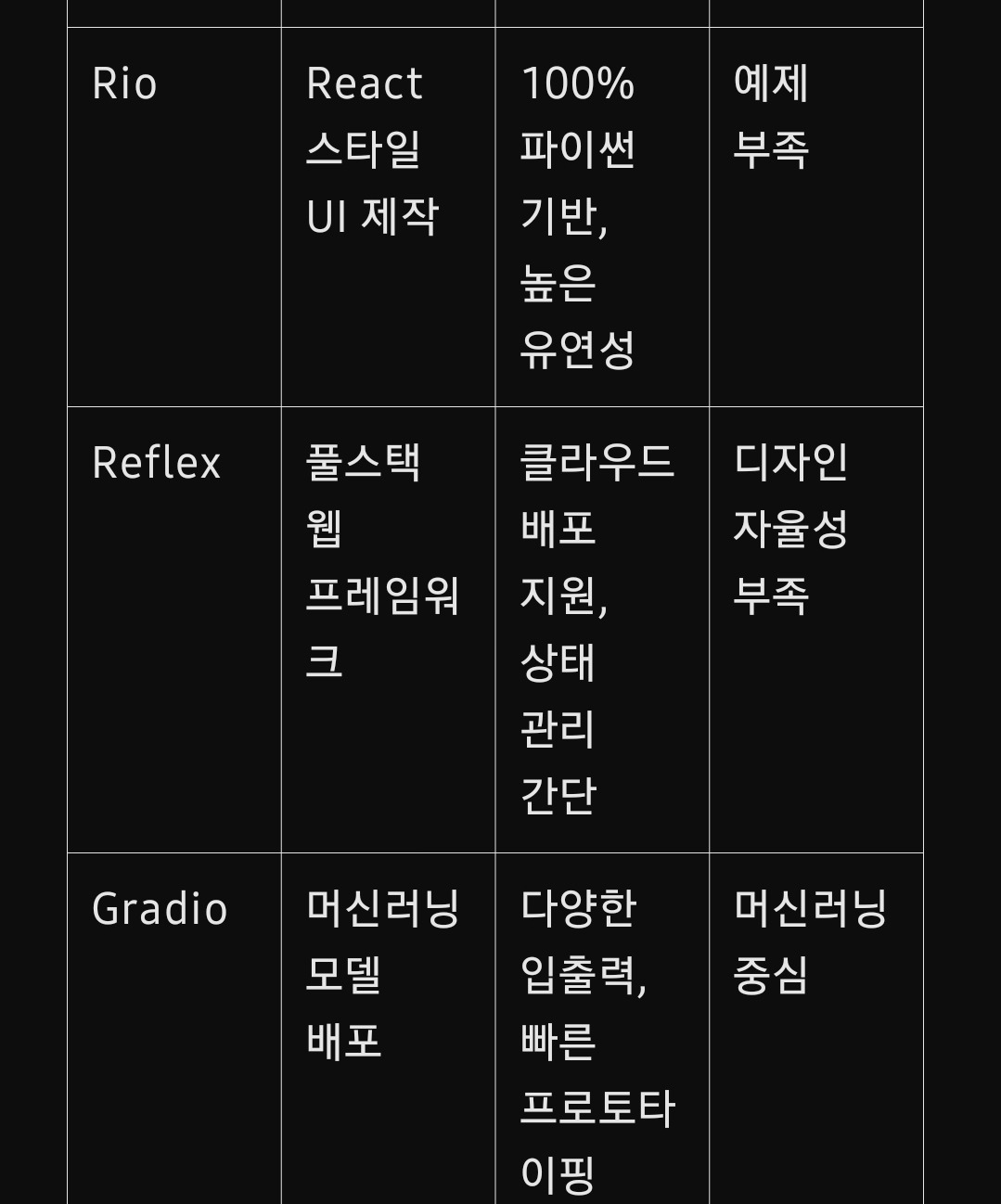 Rio는 빠르게 발전 중인 프레임워크로, 간단한 대시보드부터 복잡한 웹 애플리케이션까지 다양한 프로젝트에 적합합니다.