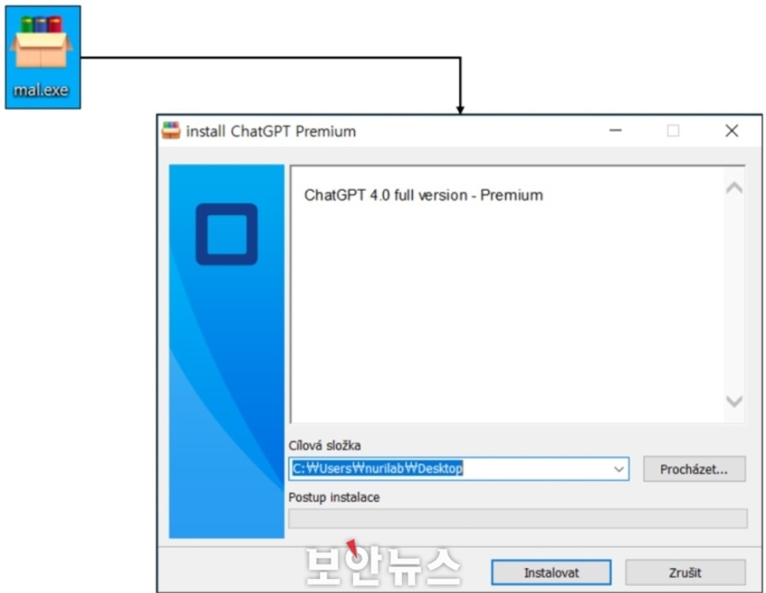 ‘ChatGPT 4.0 무료 이용’이라는 메시지를 통해 사용자를 속이고, 악성코드를 설치하도록 유도합니다.
