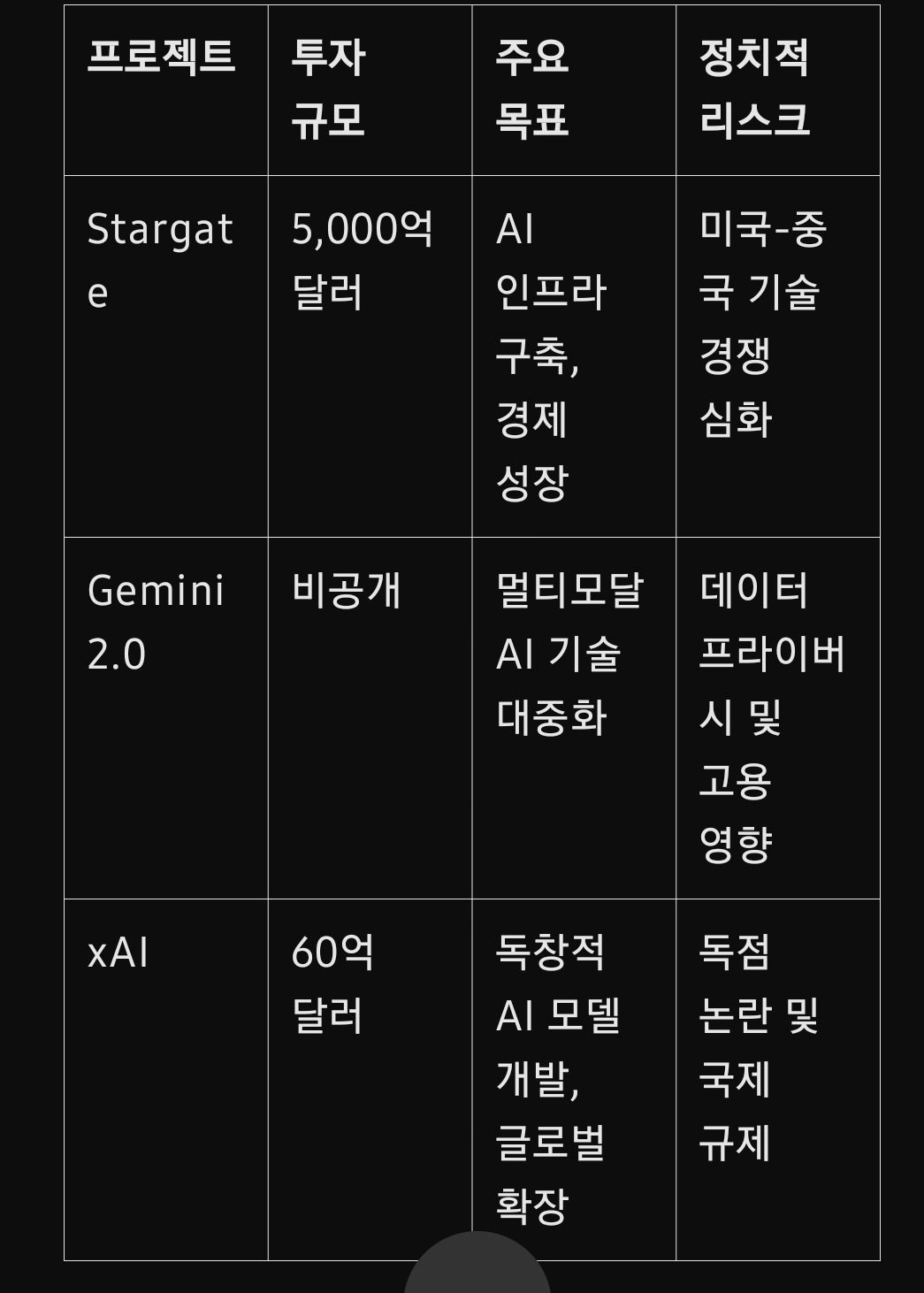 AI 기술 패권 경쟁: Stargate와 xAI는 미국 내 AI 기술 독립과 글로벌 경쟁력을 강화하며, 특히 Stargate는 중국과의 경쟁에서 미국의 우위를 점하기 위한 전략적 도구로 자리 잡고 있습니다.