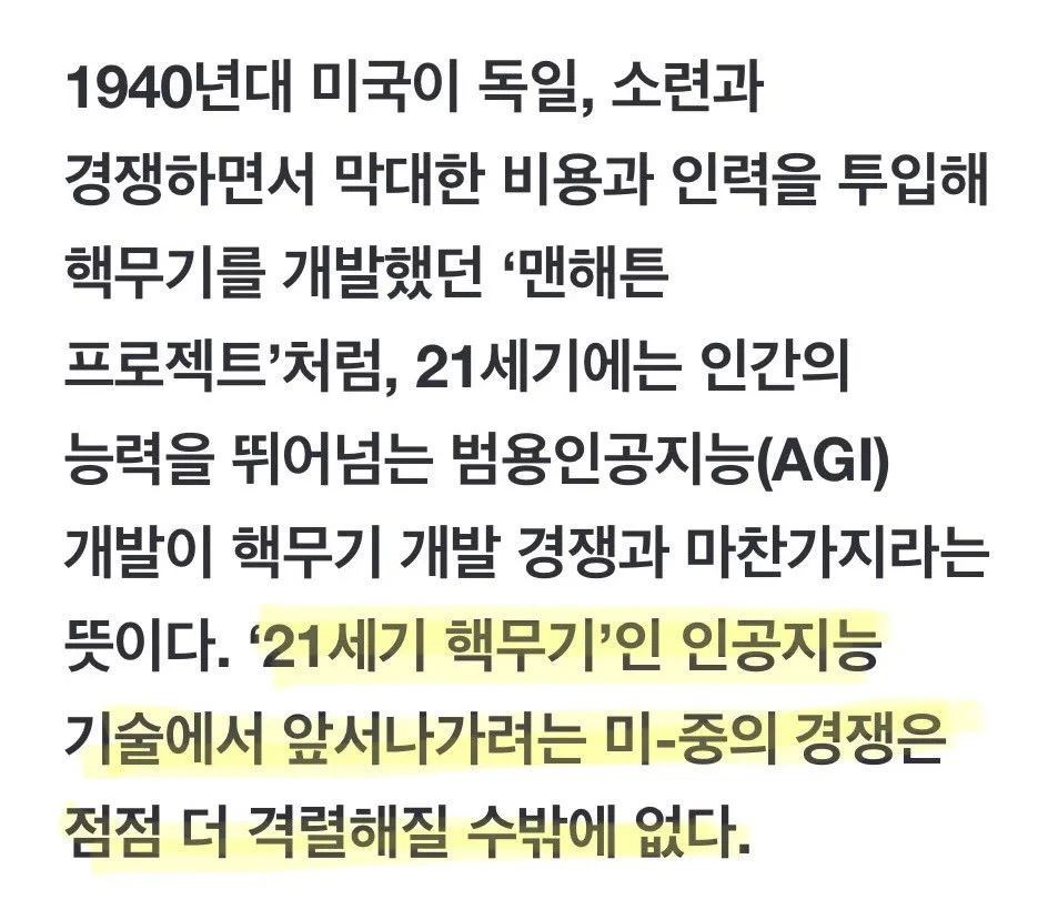 AGI는 인간과 동등하거나 이를 초월하는 인지 능력을 가진 인공지능으로, AI 기술 발전의 최종 목표로 간주됩니다. AGI를 선점하는 국가는 기술적 우위뿐만 아니라 경제적, 군사적 우위를 점할 가능성이 큽니다.