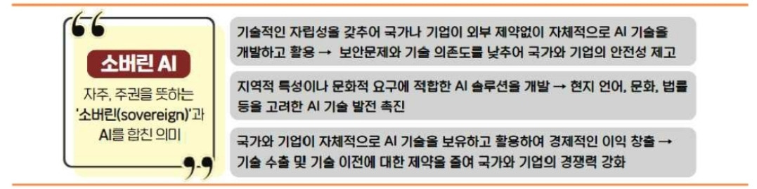 소버린 AI(Sovereign AI)는 자국의 인프라, 데이터, 인력을 활용하여 외부 간섭 없이 독립적으로 인공지능(AI)을 개발·운영하려는 개념입니다. 이는 국가적 차원의 데이터 주권을 지키고, 국방 및 보안에서의 위험을 줄이며, 각국의 언어와 문화, 가치관을 반영하는 독립적인 AI 체계를 구축하기 위한 전략적 시도로 이해할 수 있습니다. 소버린 AI의 등장은 글로벌 AI 경쟁에서의 새로운 국면을 열며, 각국의 기술적 독립성과 전략적 선택을 요구하고 있습니다.