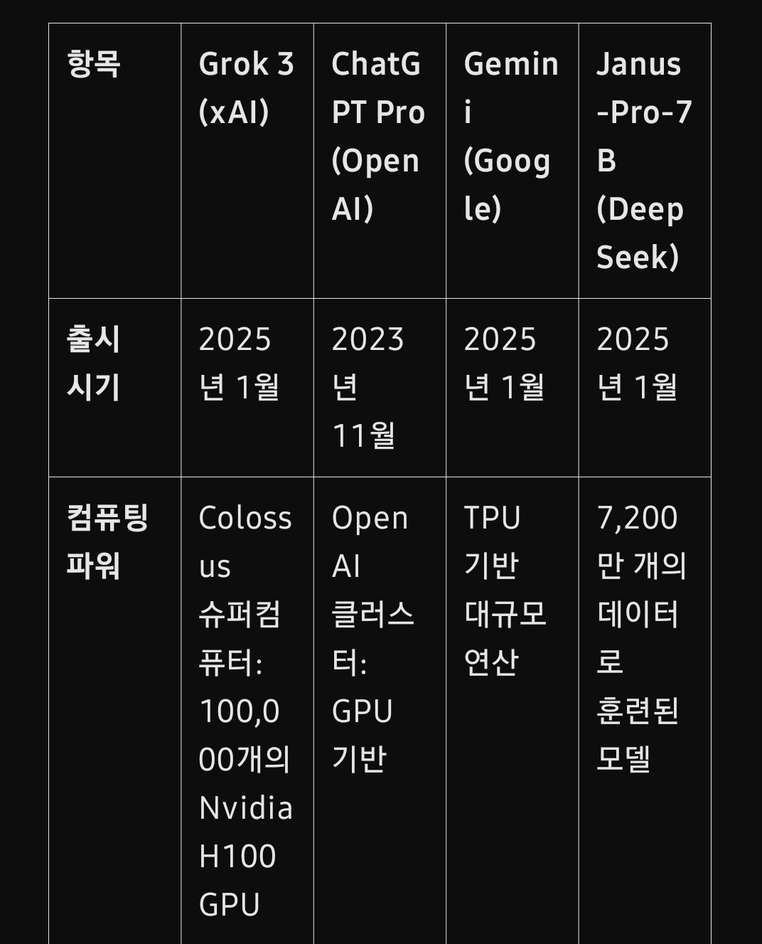 AI 기술은 지속적으로 발전하며 글로벌 기업들이 주도하는 경쟁은 날로 심화되고 있습니다. 특히, 최근 발표될 Grok 3(xAI), OpenAI의 ChatGPT Pro, Google의 Gemini, 그리고 중국 DeepSeek의 Janus-Pro-7B는 각각 고유의 기술적 강점을 바탕으로 시장에서 주목받고 있습니다. 아래에서는 이 네 가지 AI 모델을 성능, 기능, 시장 전략 등의 측면에서 비교 분석하고, 주요 시사점을 도출하겠습니다.