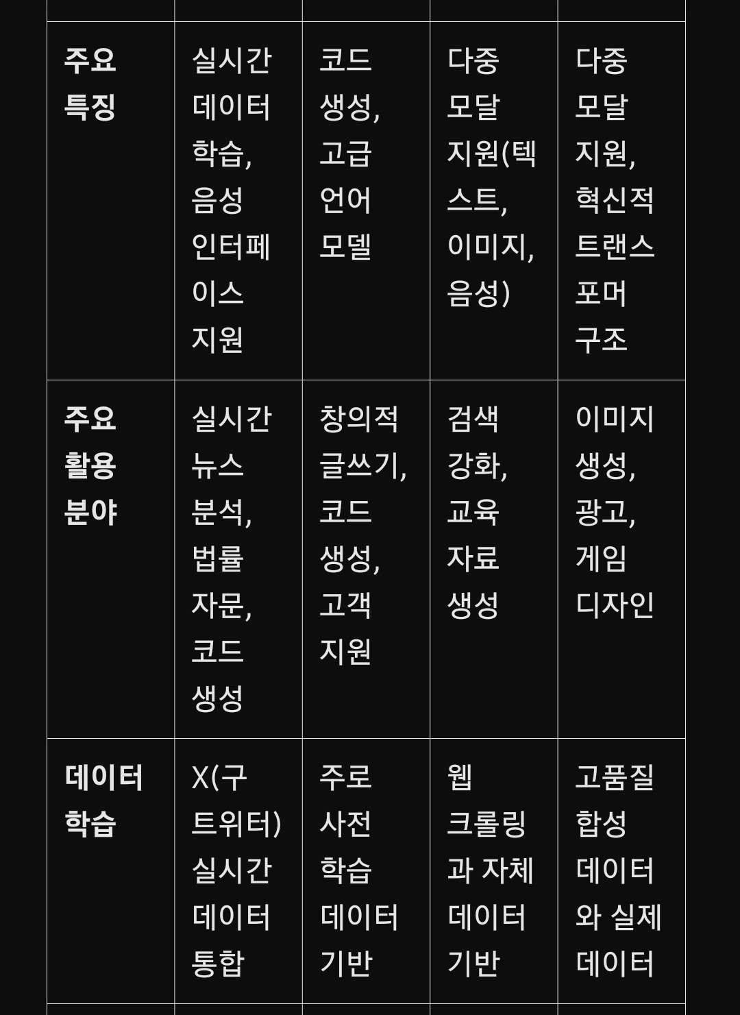 Google Gemini: TPU(텐서 프로세싱 유닛)를 기반으로 대규모 연산을 처리하며, 멀티모달 지원에서 두각을 나타냅니다.