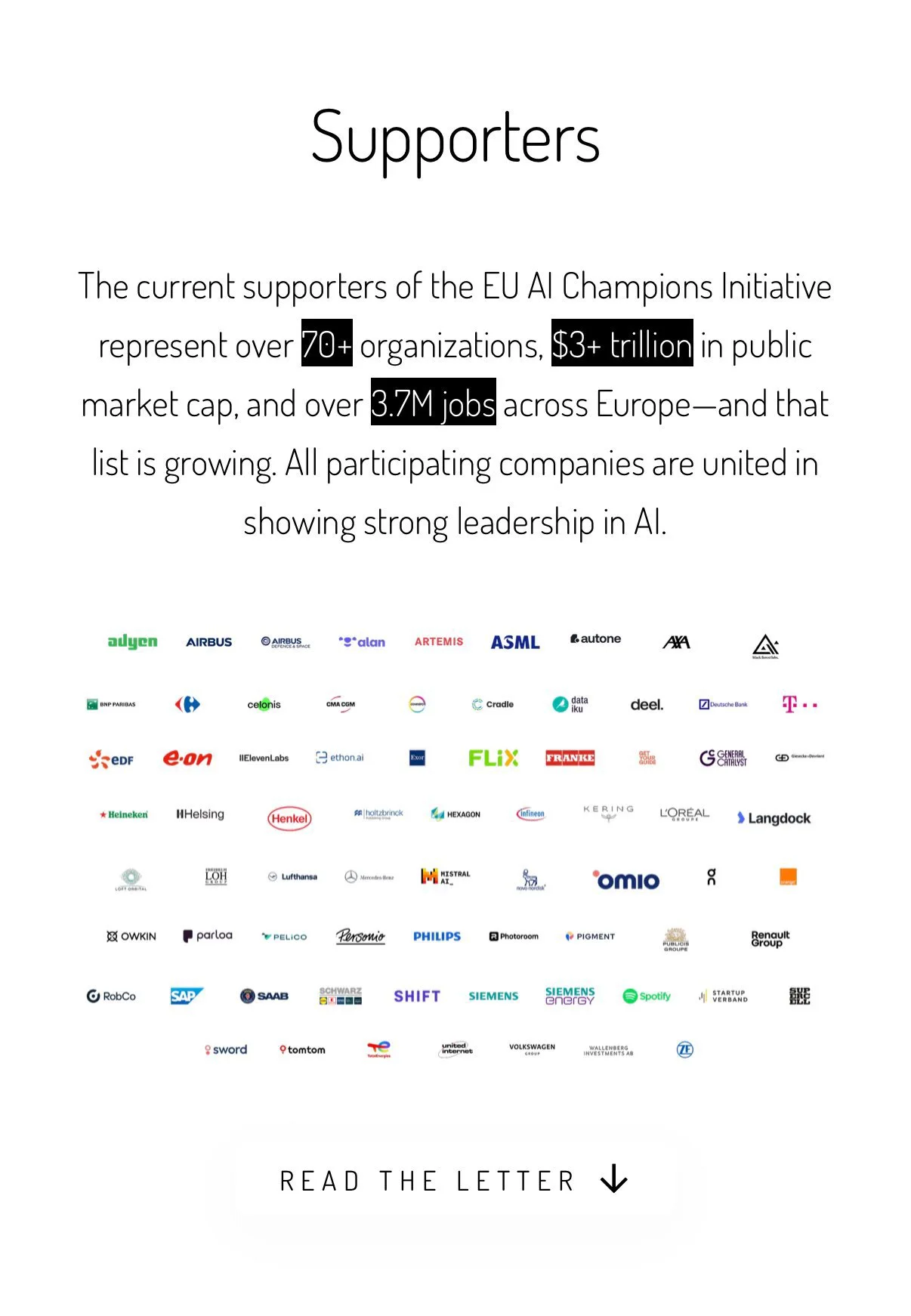 이 이니셔티브에는 유럽 전역의 70개 이상의 주요 기업들이 참여하고 있으며, 다양한 산업군에서 AI 혁신을 선도하고 있습니다. 참여 기업은 반도체, 소프트웨어, 산업 자동화, 항공우주 및 방위, 통신, 금융, 에너지, 헬스케어, 소비재, 자동차, AI 스타트업 등 광범위한 분야에 걸쳐 있습니다.