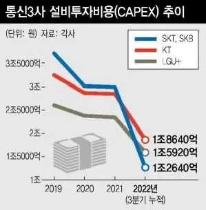 최근 발표된 자료에 따르면 SKT, KT, LG U+ 모두 CAPEX(설비투자) 규모가 2020~2022년에 걸쳐 눈에 띄게 감소하였으며, 2023년 들어서도 큰 반등 조짐이 보이지 않습니다.