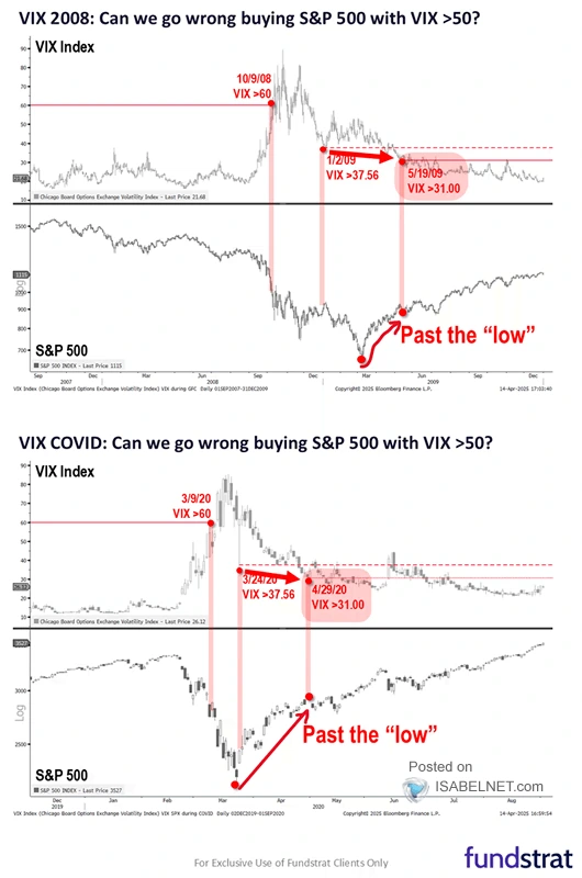 * "VIX가 진정된 후에는 늦다": VIX 지수가 최고점에서 하락하여 특정 임계치(예: 사용자가 제시한 최고점의 절반 수준인 31, 또는 40) 이하로 안정되는 시점은 이미 S&P 500 지수가 바닥을 확인하고 상당폭 반등했을 가능성이 높습니다. 따라서 VIX 지수의 '안정화'를 매수 신호로 삼는 것은 때늦은 판단일 수 있습니다.