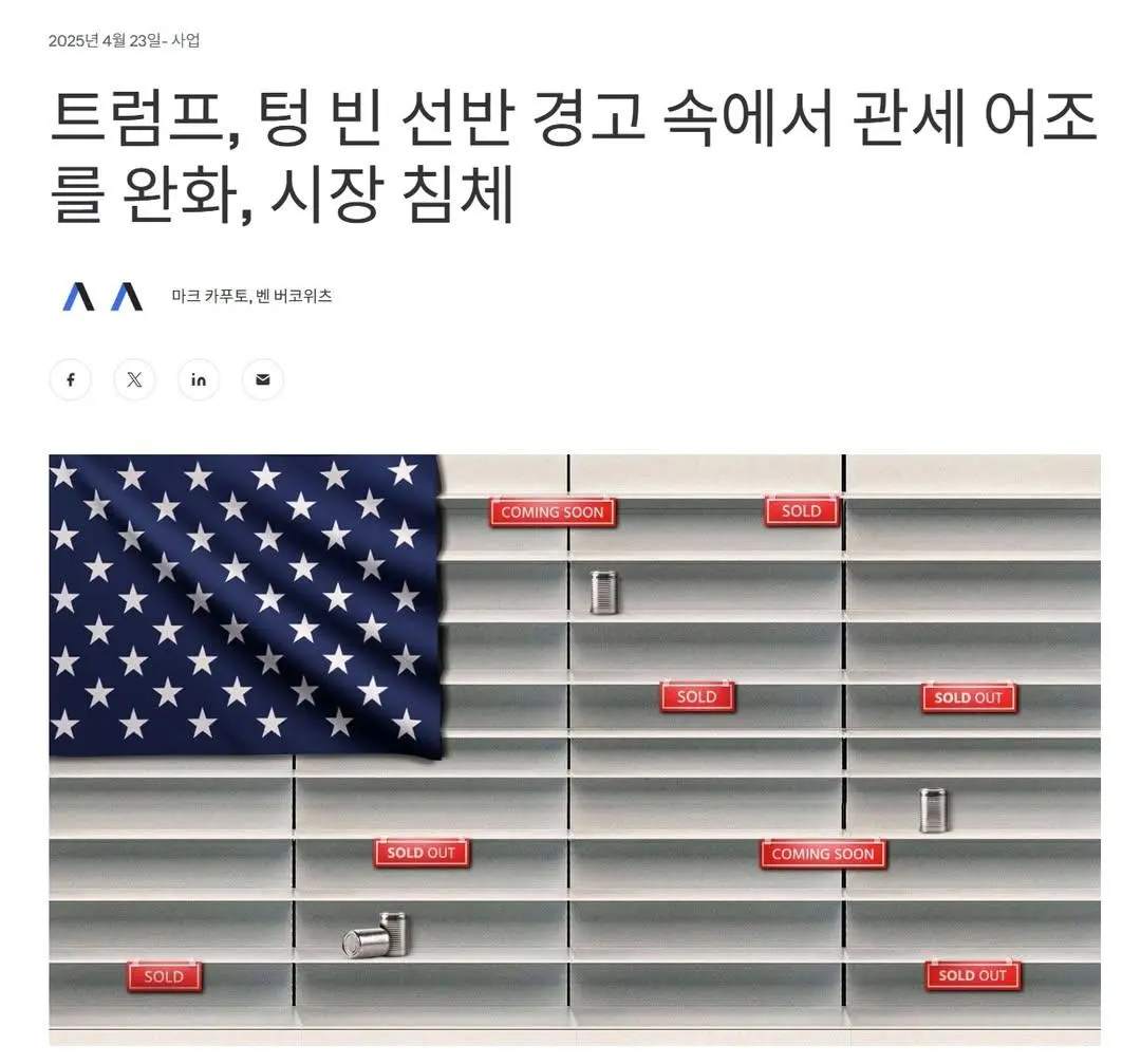 이러한 상황은 제시하신 "여름이 되면 서서히 미국인들이 사야 할 물건들이 없어질 것"이라는 우려와 연결됩니다. 특정 품목의 공급 부족이나 가격 급등은 충분히 발생 가능한 시나리오입니다. 특히 팬데믹을 거치며 글로벌 공급망의 취약성이 드러난 상황에서, 관세 전쟁은 이러한 불안정성을 더욱 심화시킬 수 있습니다. 첨부해 주신 이미지(2025년 4월 23일 자 위 기사 형태)는 "텅 빈 선반 경고 속에서 트럼프가 관세 어조를 완화"했다는 가상의 상황을 보여주는데, 이는 공급 부족 현실화가 정치적 압박으로 작용할 수 있음을 시사합니다. 실제 마트에서 물건을 두고 다툼이 벌어지는 극단적인 상황까지는 아니더라도, 특정 상품의 품귀 현상이나 급격한 물가 상승은 사회적 불만과 불안을 야기할 수 있습니다.