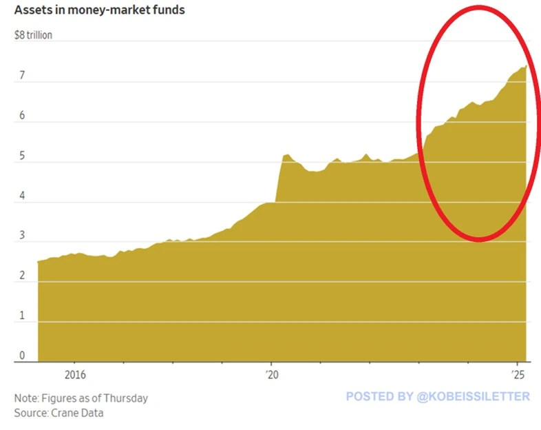 머니 마켓 펀드 자산은 놀라운 속도로 성장해 왔습니다. 2025년 3월 초에는 처음으로 7조 달러를 돌파했으며, 불과 두 달 만에 추가로 4,000억 달러가 더 유입되었습니다. 이러한 급증세는 다음과 같은 요인들에 기인합니다.