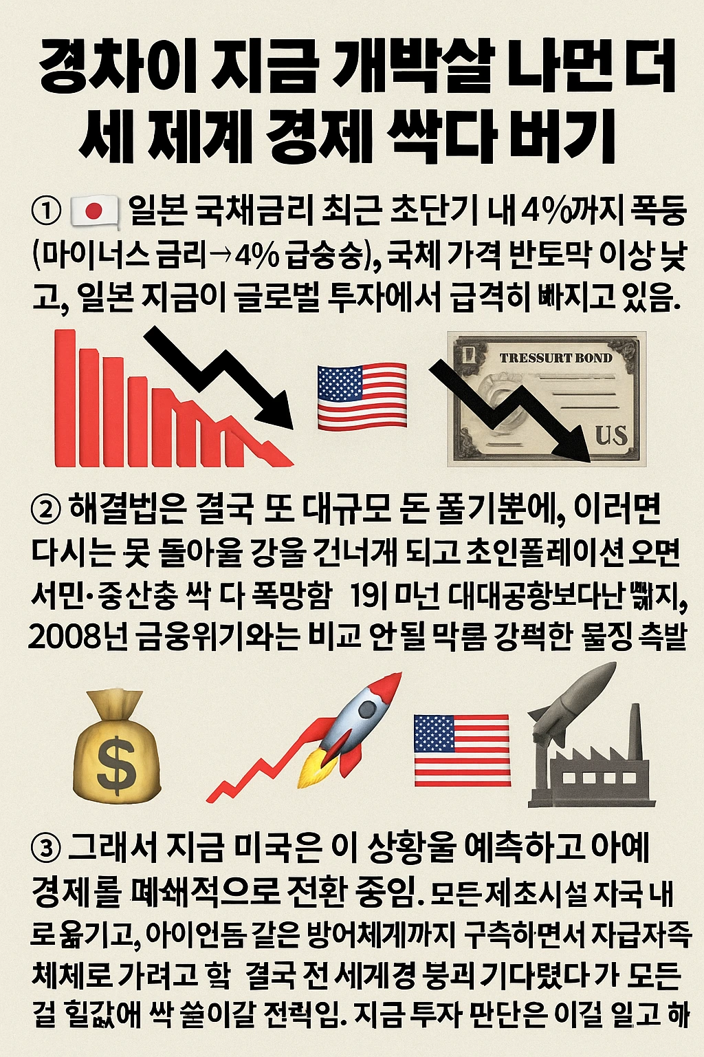 최근 온라인상에서 일본 경제의 급격한 붕괴 가능성과 이것이 전 세계 경제에 미칠 파장에 대한 우려가 확산되고 있습니다. 특히 일본 국채금리 폭등, 대규모 자금 이탈, 미국의 폐쇄 경제 전환 및 저가 자산 매수 전략 등의 주장이 제기되면서 투자자들의 불안감을 자극하고 있습니다. 본 분석에서는 이러한 주장들의 사실관계를 확인하고, 현재 일본 및 세계 경제 상황을 다각도로 점검하여 균형 잡힌 시각을 제공하고자 합니다.