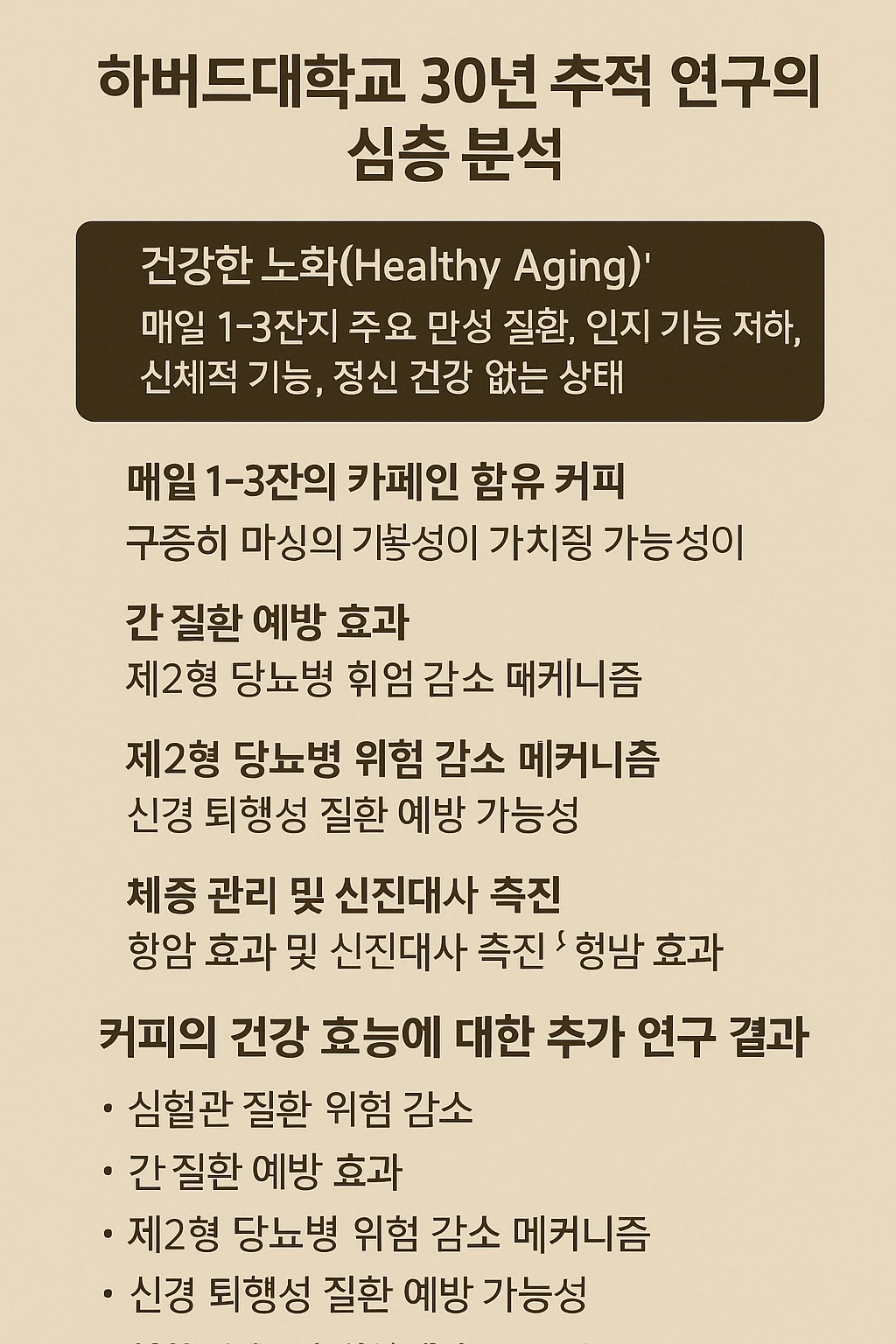 하버드대학교의 연구는 '내과 기록 보관소(Archives of Internal Medicine)'라는 저명한 의학 저널에 발표되었으며, 연구진은 무려 30년이 넘는 기간 동안 약 5만 명의 여성 간호사들의 건강 데이터를 추적 분석했습니다. 이 연구의 핵심은 중년(Midlife) 시기에 커피 섭취 습관이 노년기 건강에 어떠한 영향을 미치는지를 밝히는 것이었습니다.