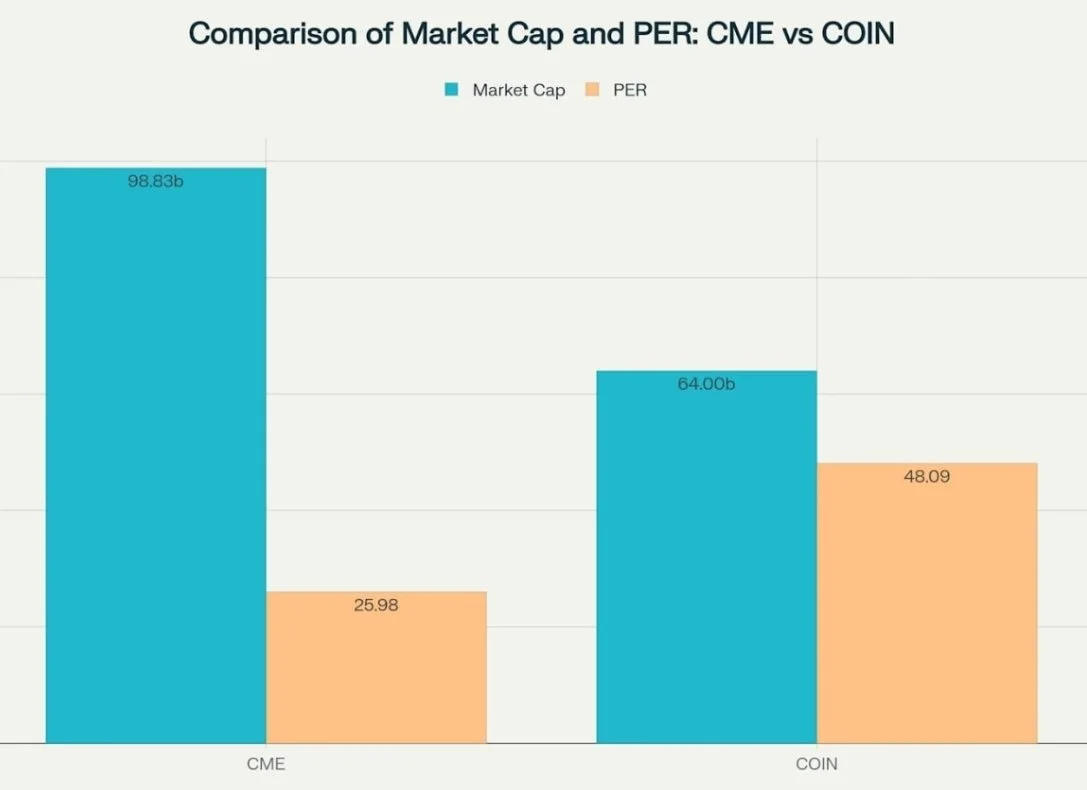 하지만 잠재적인 경쟁자로 여겨지는 암호화폐 거래소 코인베이스의 경우, 현재 시가총액이 약 640억 달러이고 PER은 48배 수준입니다. CME는 코인베이스에 비해 훨씬 안정적인 사업 모델, 독점적인 시장 지위, 그리고 전통 금융 시장에서의 높은 신뢰도를 가지고 있음에도 불구하고, PER은 오히려 낮은 수준입니다.