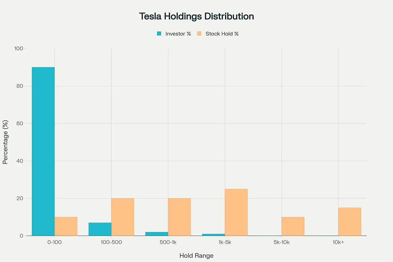 그러나 20조 3천억 원이라는 거대한 투자금액 뒤에는 심각한 불균형이 존재합니다. 전체 투자자의 90%가 100주 이하의 테슬라 주식을 보유하고 있지만, 이들이 차지하는 지분은 전체의 10%에 불과합니다. 반면, 상위 1% 미만의 극소수 투자자들이 전체 테슬라 주식의 절반 이상을 소유하고 있는 것으로 나타났습니다.