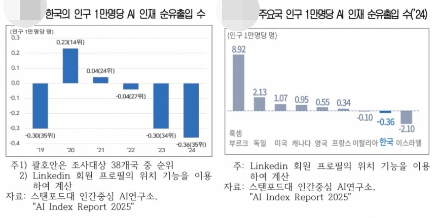 AI 기술은 반도체, 바이오, 자율주행, 로봇 등 미래 핵심 산업의 발전과 혁신을 이끄는 핵심 동력이다. 따라서 AI 분야의 인재 유출은 한국의 AI 산업 생태계를 전반적으로 약화시키고, 결국 글로벌 경쟁에서 뒤처지는 결과를 초래할 수밖에 없다. 2024년 글로벌 AI 인덱스 평가에서 한국은 종합 6위를 기록하며 비교적 높은 순위를 차지했지만, 세부 항목인 인재와 운영 환경 부문에서는 평균 이하의 평가를 받았다. 이는 아무리 뛰어난 기술력을 보유하고 있더라도, 핵심 인재를 확보하고 유지하지 못하면 장기적인 산업 경쟁력 확보가 어렵다는 것을 시사한다.