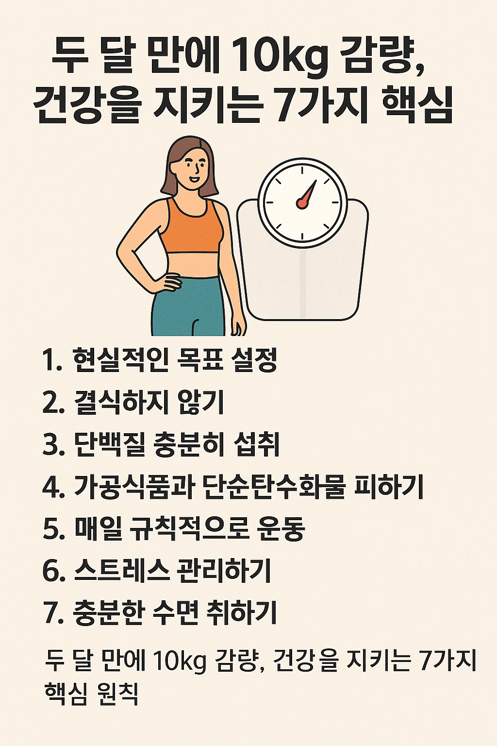 두 달 만에 10kg 감량은 매우 빠른 속도이며, 개인의 체질과 건강 상태에 따라 무리가 될 수 있습니다. 특히 만성 질환이 있거나 특정 약물을 복용 중인 경우, 다이어트 시작 전 반드시 의사 또는 임상영양사와 상담해야 합니다.