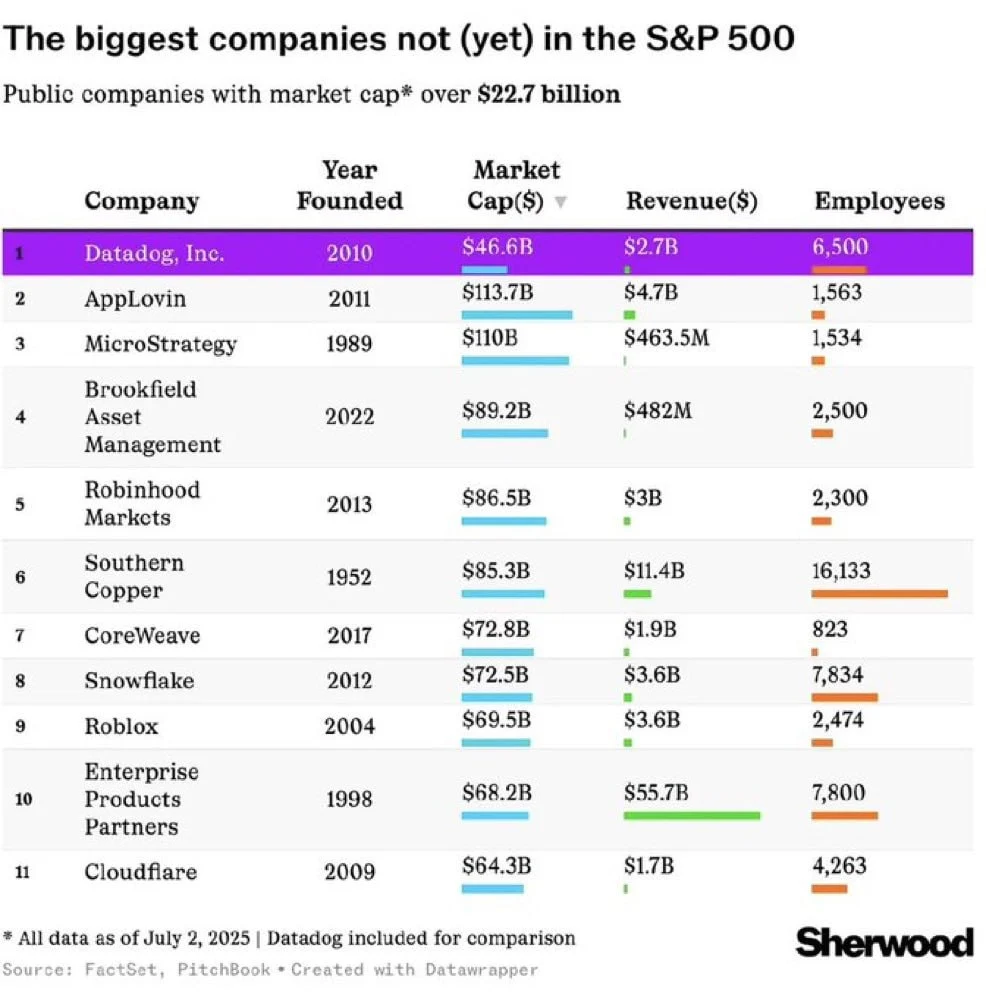 - Robinhood Markets: 시가총액 $86.5B, 매출 $3B, 직원 2,300명. 최근 수익성이 있지만, 모든 포함 기준을 충족하지 못한 것으로 보임.