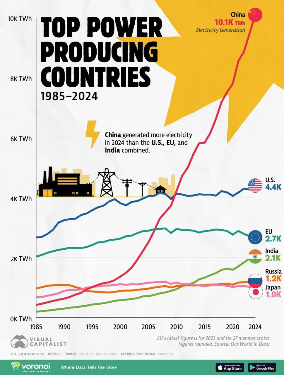 - 중국의 전력 생산량은 2024년 기준으로 미국, EU, 인도를 합친 것보다 많아, AI와 제조업에서의 경쟁력 격차가 커질 수 있습니다.