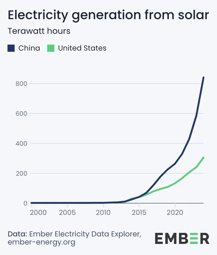 - 중국의 전력 생산량은 미국, EU, 인도를 합친 것(9,200 TWh) 보다 많으며, 이는 AI와 제조업에서의 경쟁력 격차를 초래할 가능성이 있습니다. 중국은 태양광 발전에서도 미국을 압도적으로 앞서고 있으며, 이는 에너지 인프라의 규모 경쟁력을 강화합니다.