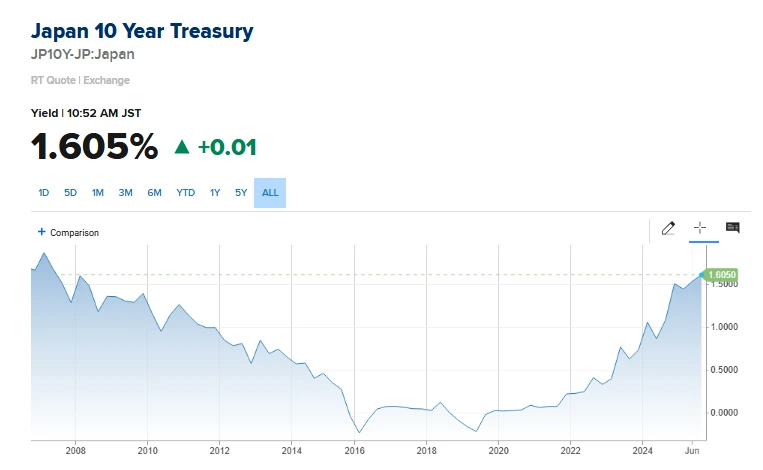 - 일본 10년물 국채 금리는 2025년 7월 25일 기준 약 1.60%로, 최근 몇 년간 급격히 상승했습니다.
