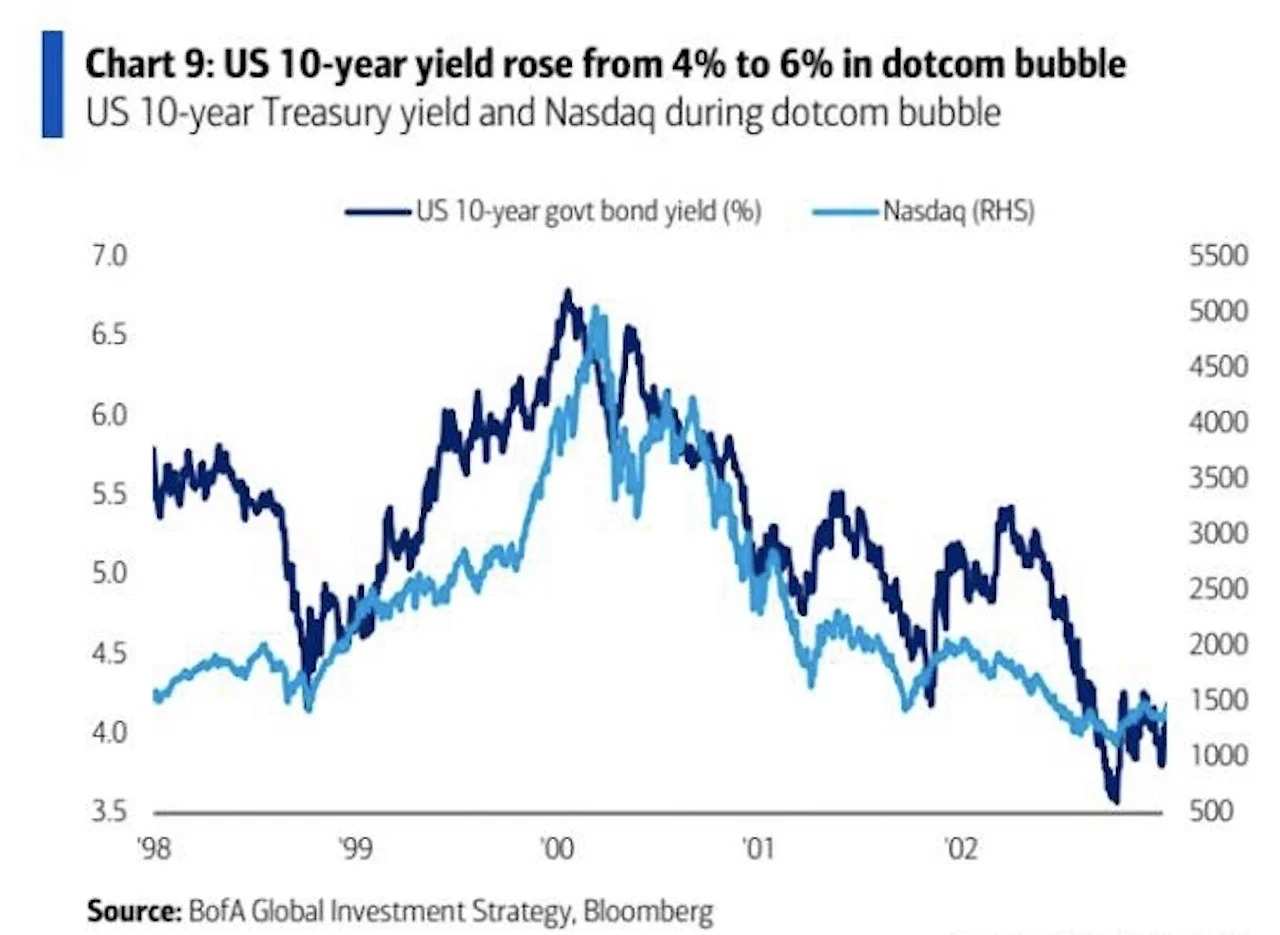 * 닷컴 버블 (1998~2002): 미국의 10년 만기 국채금리가 4%대에서 6%대로 상승하는 동안에도 나스닥 지수는 폭발적인 랠리를 보였습니다. 하지만 고금리가 장기화되고 실질금리가 치솟자, 수익 모델 없이 성장 기대감만으로 부풀려졌던 기술 기업들의 가치는 속절없이 무너졌습니다. 연준의 금리 인하가 시작된 것은 이미 시장이 하락세로 접어든 뒤였습니다.