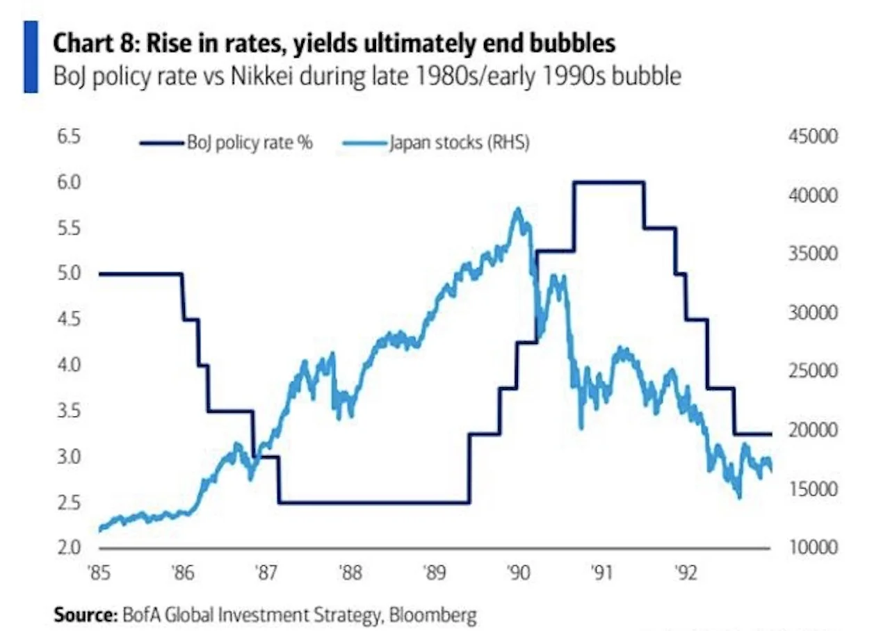 * 일본 버블 (1985~1992): 일본은행(BOJ)이 정책금리를 2%에서 6%까지 인상하는 동안에도 닛케이 지수는 한동안 상승세를 이어갔습니다. 그러나 고금리 상태가 지속되자 결국 자산 가격은 버티지 못하고 무너졌습니다. 중앙은행이 금리 인하로 방향을 틀었을 때는 이미 버블이 터진 후였습니다.