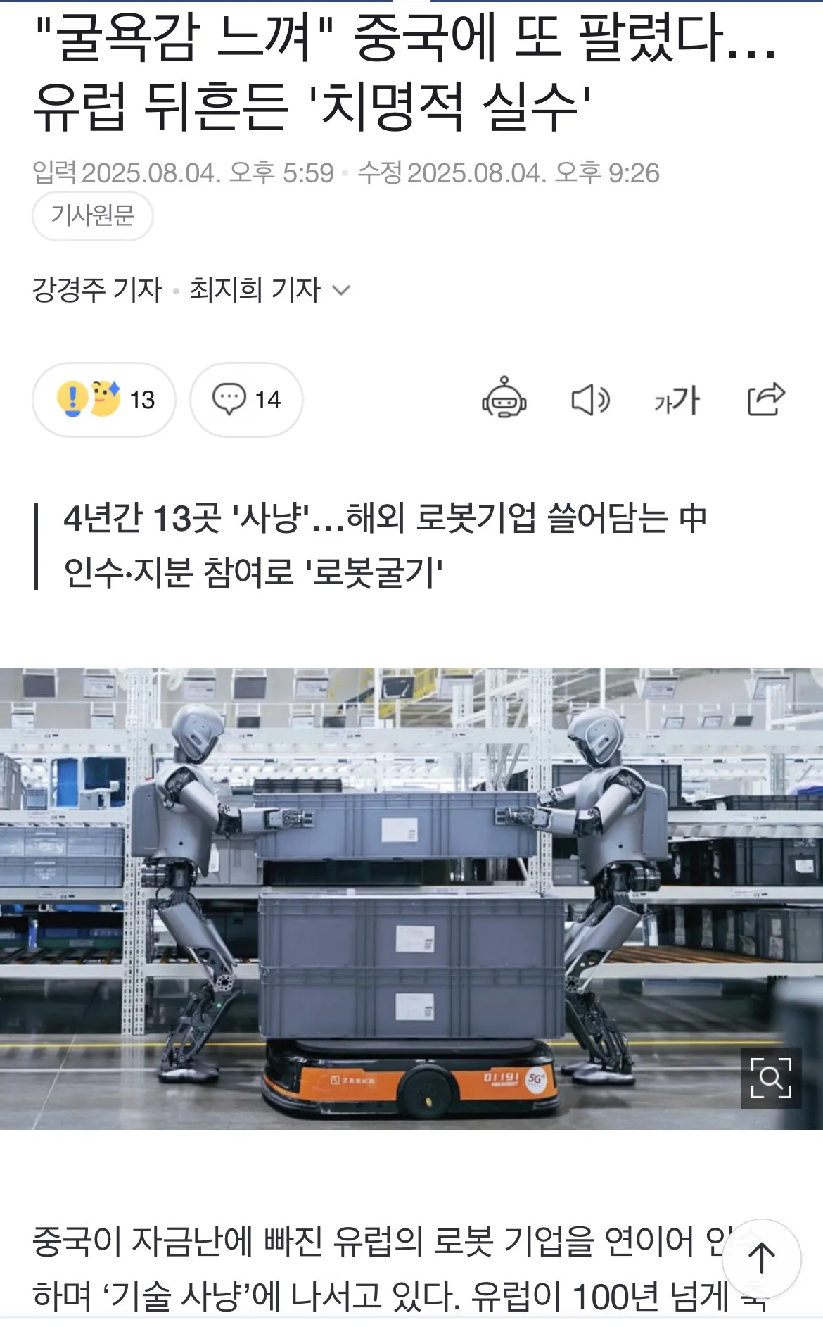 최근 동향을 보면, 2025년 기준 중국은 4년간 13곳의 해외 로봇 기업을 인수하거나 지분을 확보했으며, 특히 유럽 기업에 집중하고 있습니다. 이는 중국이 "로봇굴기"라는 전략적 이니셔티브를 통해 기술 사냥을 하고 있음을 보여줍니다. 특히, 재정적으로 어려움을 겪고 있는 유럽 로봇 기업을 타겟으로 삼아 그들의 기술을 흡수하려는 전략이 두드러집니다. 예를 들어, 최근 소셜 미디어 게시물은 중국이 유럽 로봇 기업의 기술을 "사냥"하며 유럽을 뒤흔드는 "치명적 실수"로 묘사했습니다.