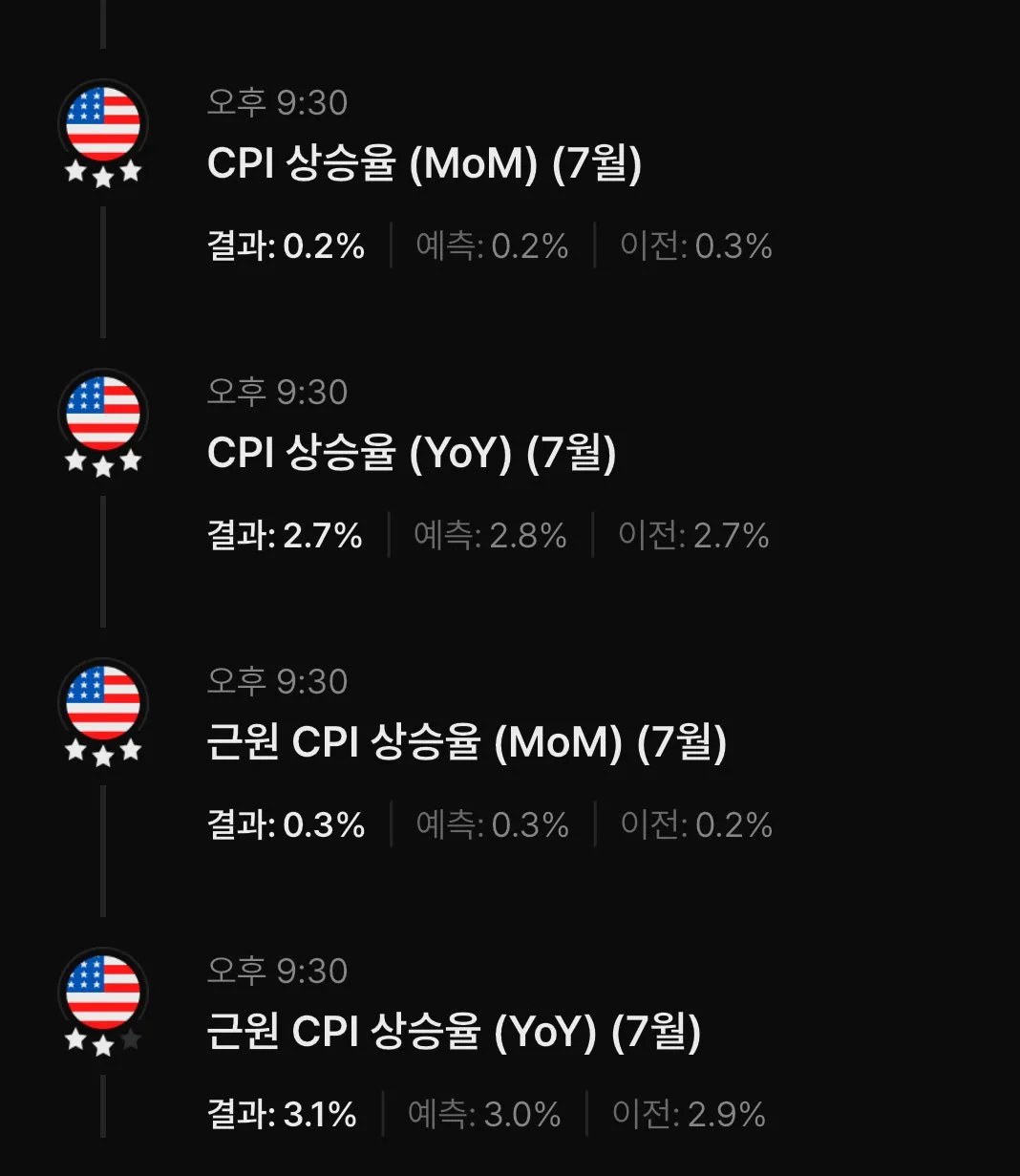 근원 CPI(식품·에너지 제외): 전월 대비 +0.3%, 전년 대비 +3.1%