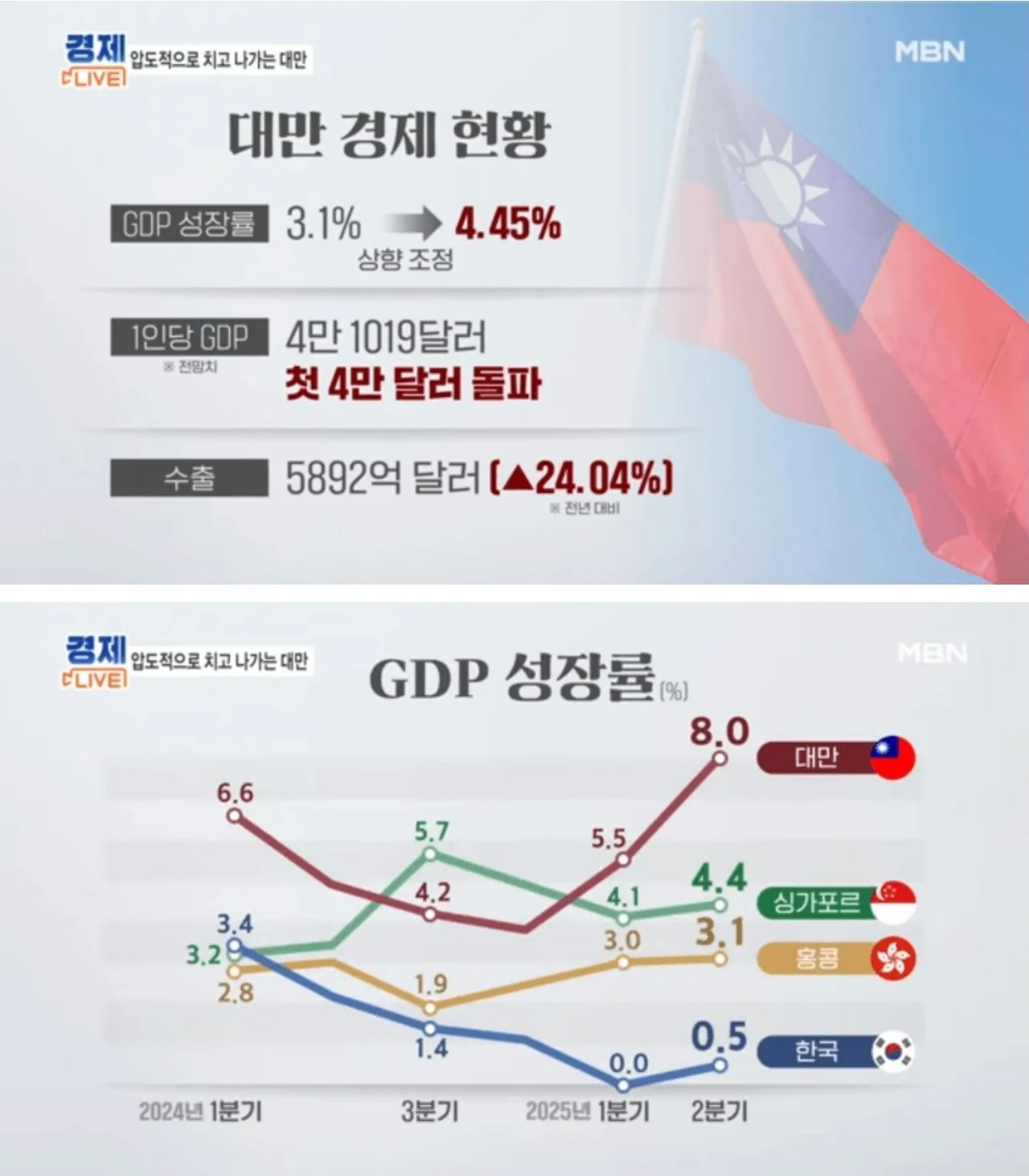 최근 대만은 2025년 GDP 성장률을 기존 3.1%에서 4.45%로 상향 조정하였다. 이는 글로벌 불확실성 속에서도 기술·반도체 중심의 경제 구조가 견고하게 작동하고 있음을 방증한다.