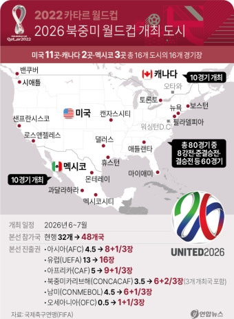 북중미(CONCACAF): 3.5장 → 6+2/3장 (3개 개최국 포함)