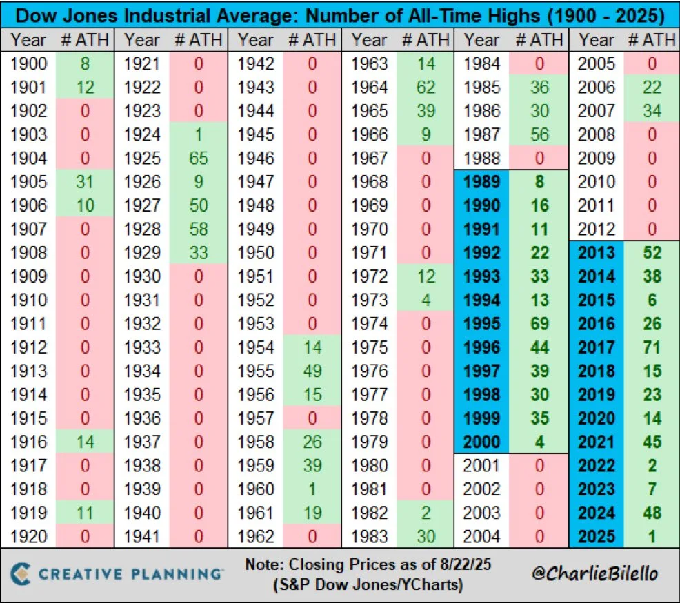 ATH 없는 시기: 19291954년, 19661982년, 2000~2012년처럼 장기간 ATH가 거의 없던 구간 존재. 이는 대공황·스태그플레이션·닷컴버블/금융위기 여파를 반영.