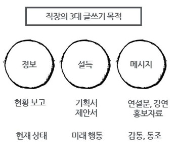 글의 목적에 따라 회사의 글쓰기는 세 가지로 구분됩니다. 정보 설득, 메시지 전달로요.