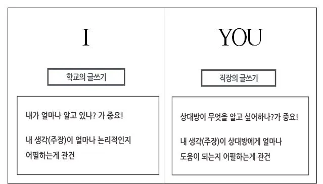차이가 보이시나요? 학생 때는 ‘내가 얼마나 알고 있고, 내 생각이 얼마나 논리적인지 어필하는 게 관건’이었다고 하면 이제는 중심축이 바뀝니다. 상대방으로요.