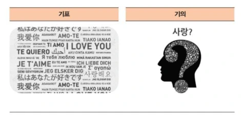 복잡하게 들리지만 간단한 얘기입니다. 예를 들어 '사랑해요.'라는 단어의 철자와 [salanghaeyo : 사랑해요]라는 발음은 기표이고, ‘사랑해요’라는 구체적 대상은 기의입니다.