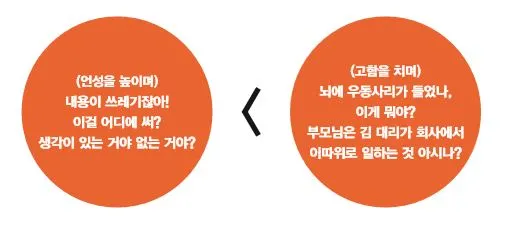 김 대리는 밖으로 나갔다가 한 시간 후 돌아왔습니다. 그리고도 종일 최 팀장의 얼굴을 제대로 쳐다보지 않고 어두운 표정으로 있다가 6시가 되자마자 나갔습니다. 보고서는 당연히 주지 않았죠. 그 이후로도 몇 주가 지나도록 굳은 표정으로 일하는 중이라 최 팀장은 일을 시킬 때마다 어색하고 불편해서 어쩔 줄 모릅니다.
