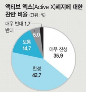객관적인 근거가 전혀 없었습니다. 액티브X 폐지 결사대가 만든 웃음 터지는 동영상과 짤방뿐이었거든요. 그래서 국민을 대상으로 설문 조사를 하기로 했습니다. 리서치 회사에 문의해보니 온라인으로만 조사하면 24시간 안에도 가능하다고 했습니다. ‘액티브X 불편 경험’과 ‘폐지 찬반’이라는 두 질문만 의뢰했더니 하루가 안 되어 800명을 대상으로 한 결과를 가져왔습니다.