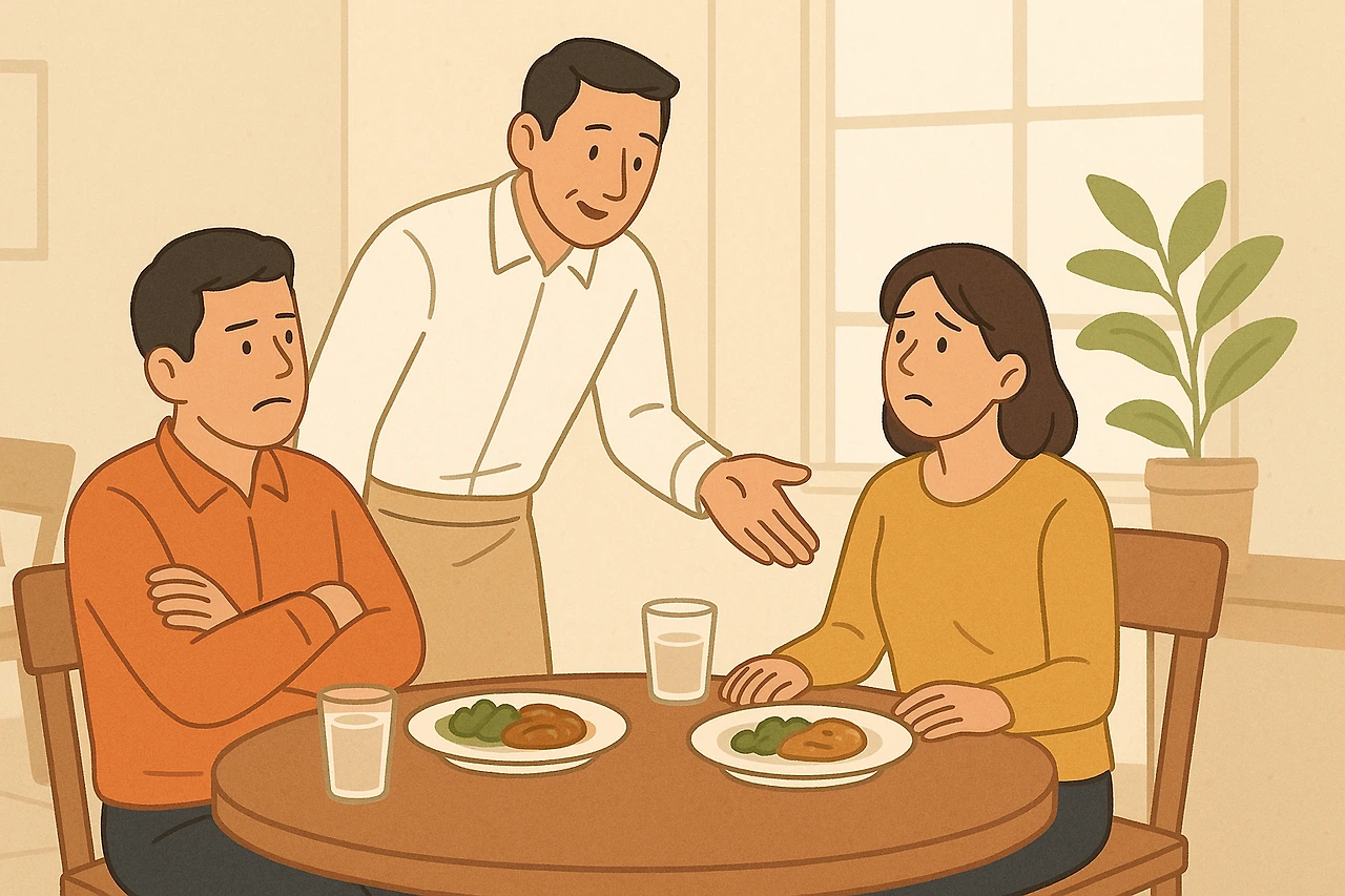 불편하다는 말은 결국 단순히 자리가 좁다는 뜻이 아니라, 식사 내내 신경 쓰이게 만드는 분위기 전체를 가리킨 것이었다.