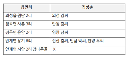 주민들을 만나 이야기를 듣기 전, 저희는 군청 혹은 면사무소에 빈집 관련 민원이 자주 들어올 것이라는 가설을 세웠으나 실제로는 그렇지 않았습니다. 피해를 보는 부분이 없다는 뜻인지 확인하고자 현장 관찰을 시작했고, 그 결과 의성에 ‘집성촌’이 많다는 것을 알 수 있었습니다. 집성촌은 같은 본관의 성씨들이 모여 사는 마을을 의미하는데, 이는 곧 한 마을의 주민들이 대부분 서로 친척임을 의미합니다. 저희가 문제정의 초기에 방문한 마을들과 집성촌 여부는 다음과 같습니다.