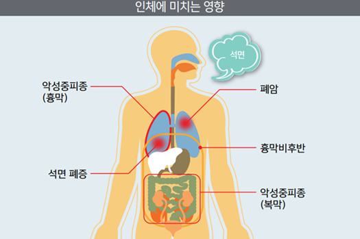 ‘침묵의 살인자’, ‘조용한 시한폭탄’으로 불리는 석면은 15~40년의 잠복기를 가지고 있으며 석면폐증, 악성중피종, 흉막비후과 같은 질병을 유발하고, 산이나 알칼리 등에 부식되지 않아 반영구적으로 우리 몸에 남아 지속적으로 손상을 줍니다.