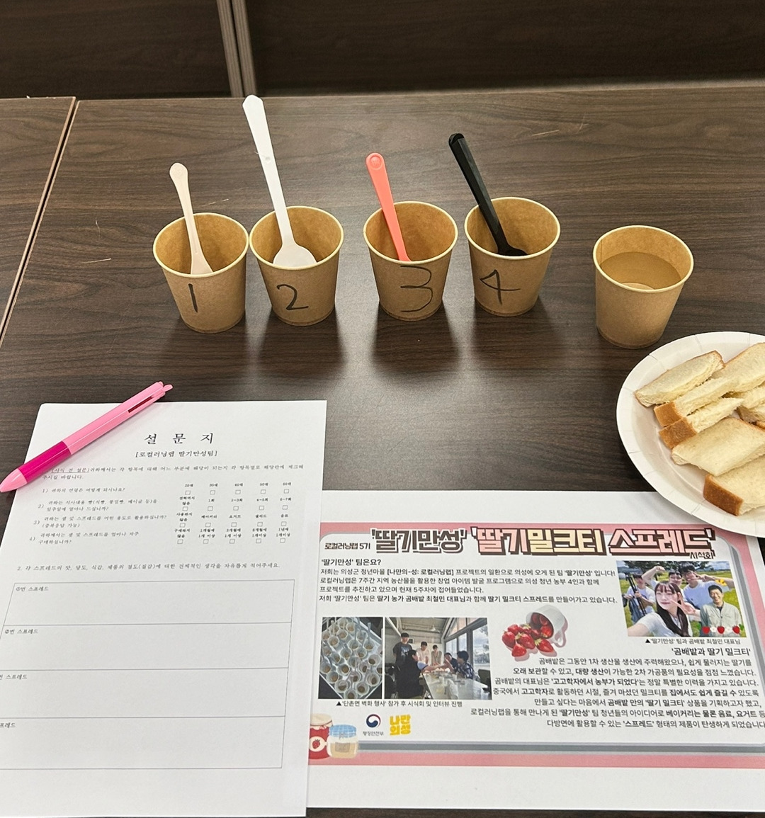 이번 테스트의 주목적은 ‘스프레드 맛 선호도 확인 & 완성도 평가’ 였습니다. 그래서 스프레도 맛, 질감, 당도에 대한 설문을 진행했습니다. 의성 군청에서 20~40대 여성을 대상으로 22명과 시식회를 하였고, 이후 심층 인터뷰를 통해 선호하는 포장 형태(유리병, 스틱형 등)와 평소 라이프 스타일에 대한 질문을 나눴습니다.