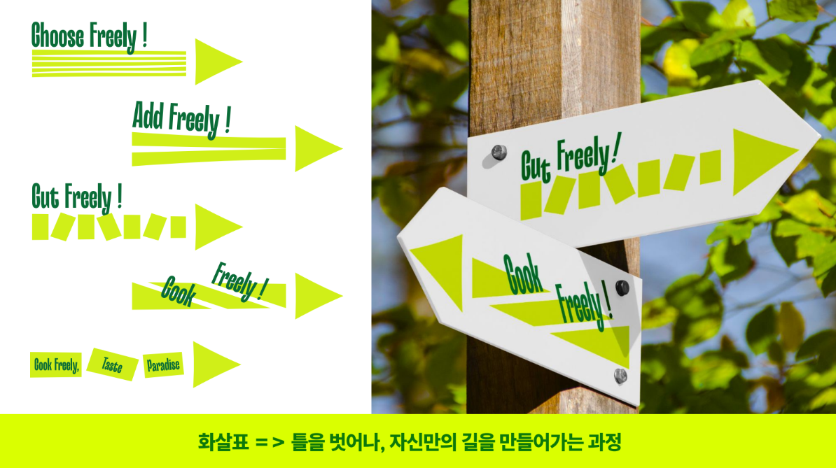 브랜드 방향성 설정을 위해 아스파라다이스의 핵심 가치에 대해 정리했습니다. 아스파라거스가 미식이라는 키워드와 깊이 연결되어 있다는 것에서 착안하여 미(美)식이 어렵고 비싼 게 아니라, 나만의 방법으로 자유롭게 요리하는 것이라는 메시지를 설정했습니다.